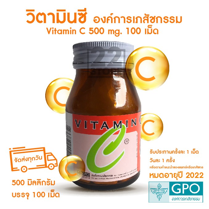 วิตามินซี gpo 500 mg (100 เม็ด) vitamin c องค์การเภสัชกรรม (หมดอายุ 03/2566) ฿405 ฿ 203